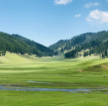 Bangus Valley is one of Kashmir’s most secluded and pristine landscapes, located in the Kupwara district near the Line of Control. Perched at an altitude of around 3,000 meters, the valley is divided into Bada Bangus (Big Bangus) and Chota Bangus (Small Bangus), both known for vast alpine meadows, wooden shepherd huts, and uninterrupted mountain horizons.